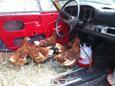 Case in point: Kevin's chicken coop, or as he likes to call it, his "Porsche Coop". This isn't just any old coop, this one is constructed out of an old car! What an awesome use of something that would have taken up a lot of space at the dump! When Kevin started telling me about his coop, during his last visit to the store, I knew I had to know more.